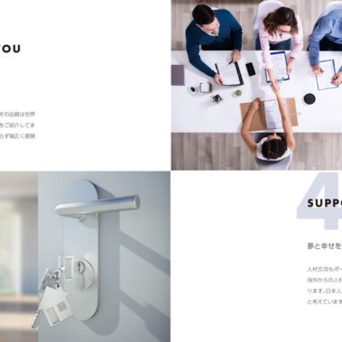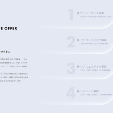 弊社は、4本の柱である物品事業・不動産事業・広告代理事業・リクルート事業を中心に、中国・アメリカ・韓国などの海外の国々と連携しながら、グローバルビジネスを展開しています。
